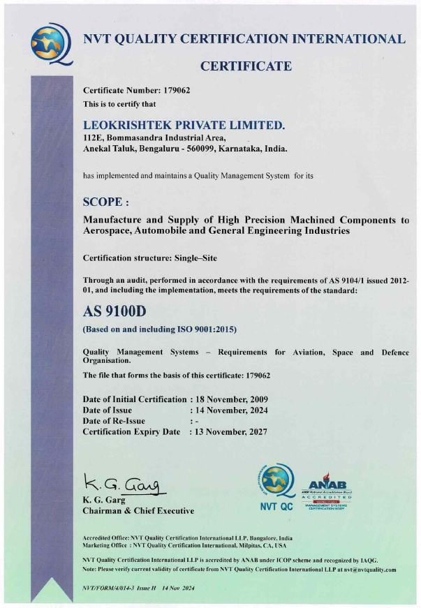 • AS 9100 REV D certified by NVT QUALITY CERTIFICATION INTERNATIONAL LLP.